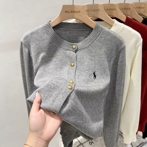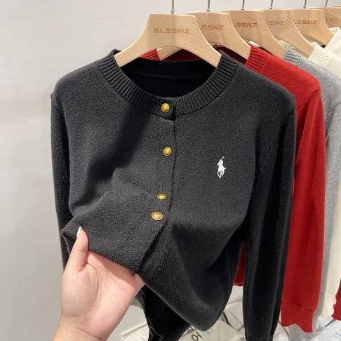 它沒有複雜的設計,只用柔軟親膚的針織材質、精緻的金屬圓釦,以及胸前那一抹低調卻醒目的小馬刺繡,為妳的日常穿搭注入一份細膩的質感與優雅。