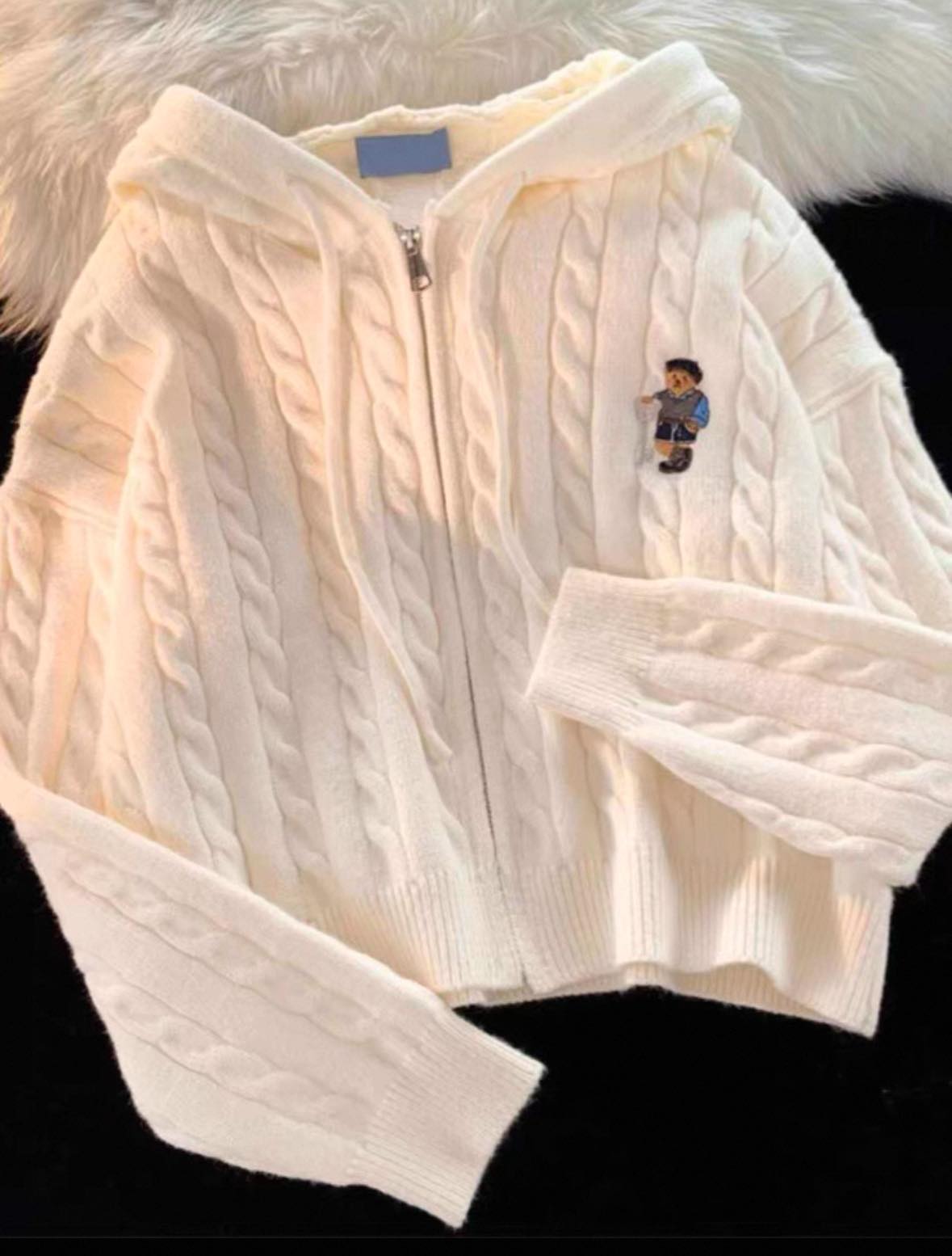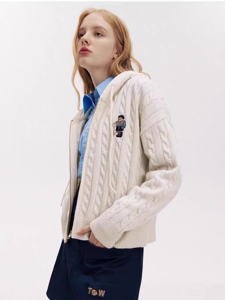 這款小熊連帽毛衣,溫暖又時尚!加厚設計,讓妳在寒冷的季節保持舒適,質地柔軟細膩,親膚又保暖。經典的麻花紋路搭配可愛的小熊刺繡,簡約又不失細節感。