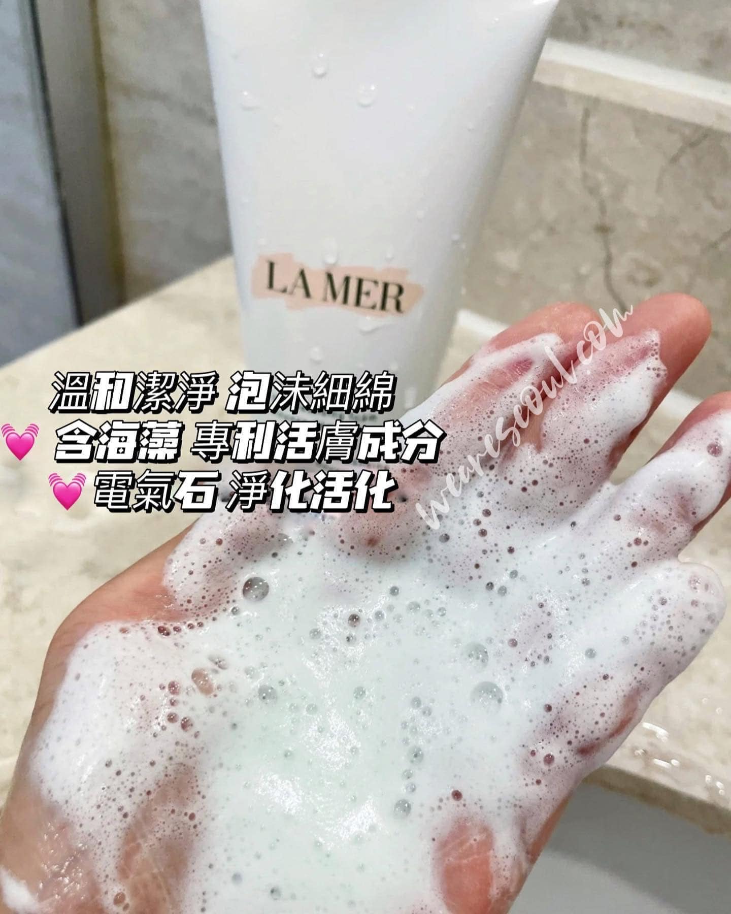 特別針對亞洲女性的肌膚做設計,內含海藻纖維,讓清潔力上升,而且成分內特別添加翠玉和珍珠粉末礦質的微量元素,讓產生的泡沫可以美白肌膚,還讓肌膚可以有效抓住後續保養時的滋潤能力,高保濕的效果讓你洗完肌膚也不乾澀