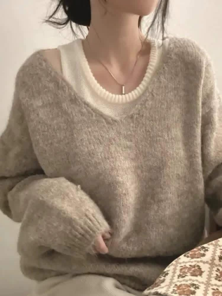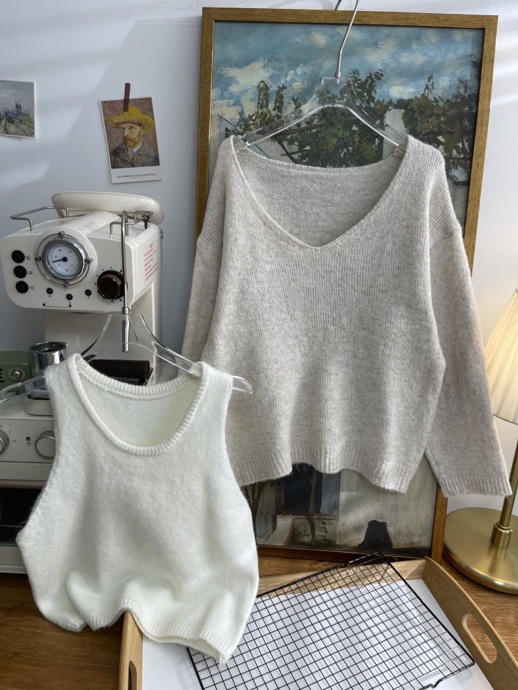 韓風 INS 簡約慵懶感爆棚|假兩件疊穿針織背心+軟糯寬鬆毛衣兩件套